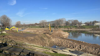 - Gleichzeitig erfolgt die Verschwenkung des Stromstrichs. Hierbei wird durch Ufervorschüttungen und -rücknahmen ein leicht mäandrierender Uferverlauf geschaffen. Diese Arbeiten finden sowohl im westlichen und auch im östlichen Bauabschnitt statt.