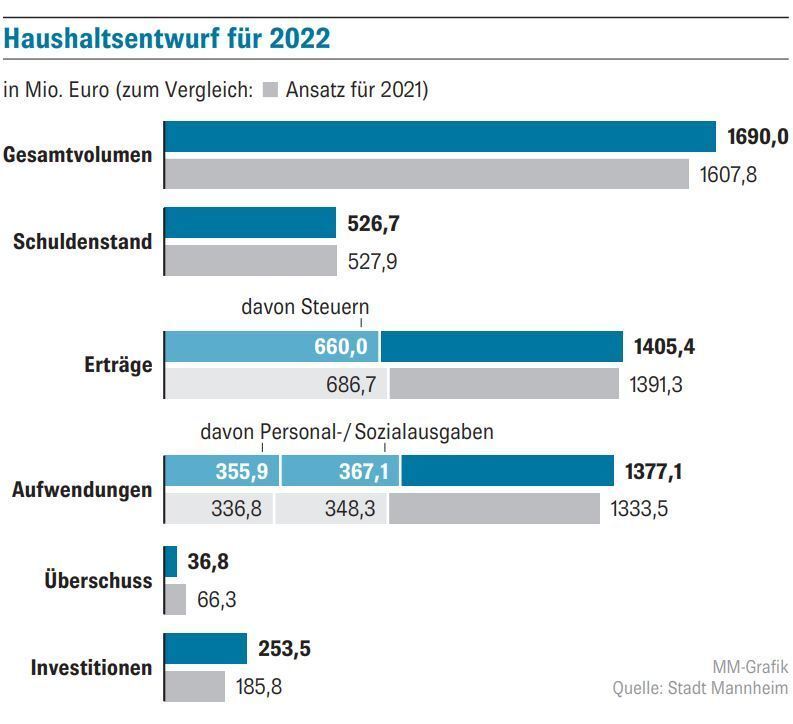 - Der Entwurf der Stadtverwaltung für den Haushalt 2022 sieht enorme Investitionen in einer Größenordnung von rund 250 Millionen Euro vor. Zu den größten Einzelposten gehören die für 2022 eingeplanten Beträge für Theatersanierung (29 Millionen) und Grünzug Nordost (26 Millionen). Außerdem das Geld für das Komibad im Herzogenried (13 Millionen), die neue Schule auf Franklin (12,5 Millionen) und die Buga (12,3 Millionen).