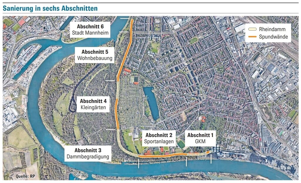 Die Genehmigungsbehörde – also die Stadt Mannheim – wägt diese Einwendungen ab, vergleicht verschiedene Varianten und erarbeitet einen Planfeststellungsbeschluss. Dieser enthält dann alle für die Dammsanierung notwendigen Teil- und Einzelgenehmigungen. Dieses Vorgehen dauert etwa zwei Jahre. Baubeginn wird deshalb frühestens 2022 sein. Nach den Planungen des RP wird die Sanierung danach abschnittsweise über einen Zeitraum von gut vier Jahren – also bis etwa 2026 – ausgeführt.