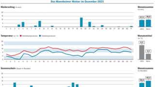 Der Dezember 2023 war der 15. in Folge mit auffallend hohen Temperaturen und gehört zu den acht wärmsten Weihnachtsmonaten seit 1881. Das hat der Deutsche Wetterdienst (DWD) mitgeteilt. In Mannheim war der Monat ganze vier Grad zu warm. Die positive Abweichung konnten auch die winterlichen Bedingungen im ersten Monatsdrittel nicht ausgleichen. Durch „bemerkenswert hohe Niederschlagsmengen“ gehört der Monat zudem bundesweit zu den nassesten zehn Monaten seit Beginn der Wetteraufzeichnungen - nur in Mannheim blieb er etwas trockener als sonst.