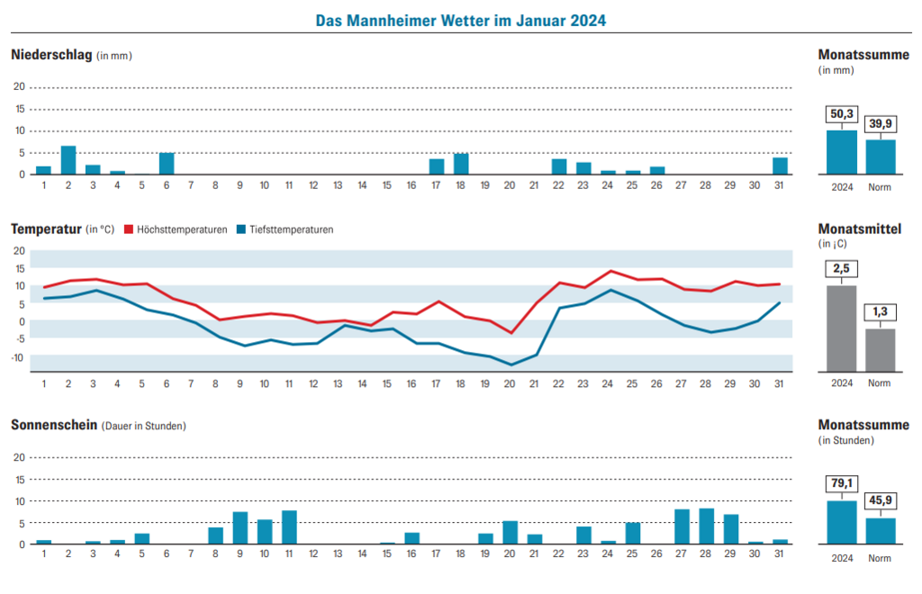 Die Folge: Diese Temperaturwende führte am 24. zu Höchstwerten von 15 Grad im Oberrheingraben. Auch in Mannheim lag die Temperatur im Mittel 1, 2 Grad über dem Durchschnitt. Gerade die milden Witterungsabschnitte zeigten dann auch einige Niederschläge in der Quadratestadt. Mit rund 85 Stunden und einem Plus von fast 75 Prozent gegenüber dem Klimamittel von 49 Stunden war der Südwesten die sonnigste Region Deutschlands. Auch in Mannheim gab es fast 80 Sonnenstunden – normal sind hier im Mittel rund 45.