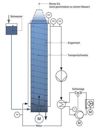 Sie sind die Basis, mit der Erlbeck das Salz vom Eis trennt. Und das funktioniert so: Salzwasser fließt in einen Zylinder. Eine Kühlanlage senkt die Temperatur im Inneren des Behälters runter auf Minus zehn Grad, hier gefriert selbst Salzwasser. Aber noch befindet sind in den gewachsenen Eiskristalle zu viel Salz.