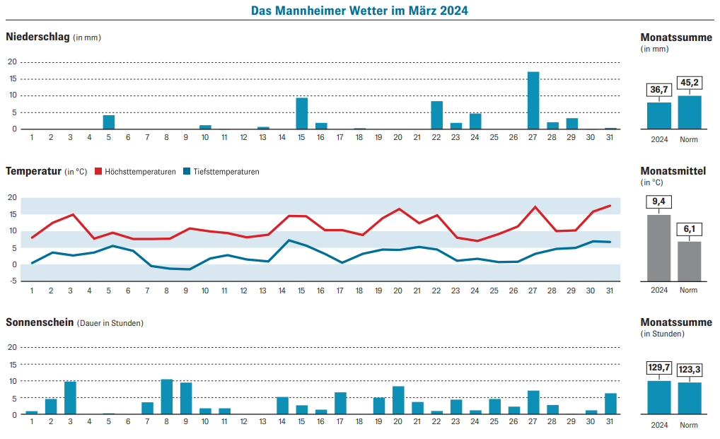 In Mannheim lag die Temperatur im März mit 9,4 Grad 3,3 Grad über dem langjährigen Mittel. Damit lag sie höher als im gesamten Südwesten: Dort betrug das Temperaturmittel 7,4 Grad, ein Wert, den ein durchschnittlicher April aufweist. Beim Sonnenschein gab es in der Quadratestadt derweil nur geringe Abweichungen nach oben. Zudem war der März etwas trockener als sonst.