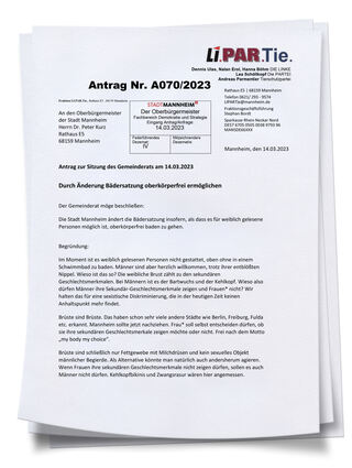 In einer von der SPD am Tag vor der Ausschuss verschickten Pressemitteilung ist nicht von „weiblich gelesenen Personen“ die Rede, sondern schlicht von Frauen. Die sportpolitische Sprecherin Andrea Safferling erklärt, sie befürworte eine Anpassung der Mannheimer Bädersatzung, weil das zu mehr Freiheit und Gleichheit führe. Frauen sollten genau wie Männer selbst bestimmen können, „ob sie oberkörperfrei baden gehen wollen oder eben nicht“.