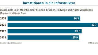 Für die folgenden Jahre 2027 und 2028 sind 26,8 und 25,9 Millionen vorgesehen - immer jeweils inklusive möglicher Fördermittel von Bund und Land. Stadtspitze wie auch Gemeinderatsfraktionen würden gerne mehr investieren - doch wegen Mannheims angespannter Finanzlage ist das ziemlich schwierig.