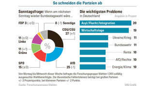 Mannheim. Die Bundesregierung kommt mit Blick auf die Umfragen einfach nicht in die Gänge. Auch im aktuellen Politbarometer der Mannheimer Forschungsgruppe Wahlen haben die Unionsparteien (27 Prozent) und die SPD (15 Prozent) keine Mehrheit im Bundestag. Da ist es für Kanzler Friedrich Merz nur ein schwacher Trost, dass die AfD jetzt wieder zwei Prozentpunkte hinter der CDU/CSU liegt. Union und SPD haben im Vergleich zu den ohnehin schon miesen Ergebnissen der Neuwahl im Februar in der Umfrage sogar noch schlechtere Werte. Tristesse statt Aufbruchstimmung.