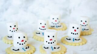 Ein rundes Plätzchen mit weißer Glasur ist der geschmolzene Teil des Schneemanns, darauf kommt ein Marshmallow als Kopf - verziert mit Schokoaugen und Mund. Die Ärmchen werden auf die Zuckergussbasis gemalt und dazu bunte Schokoperlen als Knöpfe verstreut.