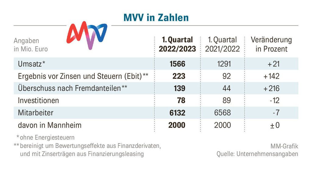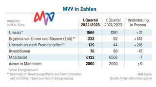 Die Umsatzsteigerung um 21 Prozent auf rund 1,6 Milliarden Euro führt die MVV vor allem auf die höheren Großhandelspreise für Strom und Gas zurück. Das Ergebnis (Ebit) – 223 Millionen Euro – stieg im Vergleich zum Vorjahr um 142 Prozent. Mitverantwortlich für diesen hohen Gewinn ist der Verkauf der tschechischen MVV-Tochter im Berichtsquartal. Ohne diesen Einmaleffekt sinkt das Ergebnis auf 145 Millionen Euro, das ergibt aber immer noch ein Plus von 58 Prozent.