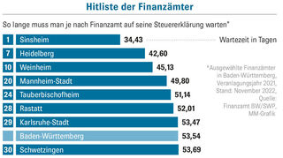 Auch innerhalb von Baden-Württemberg gibt es große Unterschiede. Das zeigt die Liste aller 63 Finanzämter im Land, die unserer Zeitung vorliegt; als Erste hatte die Südwest Presse in Ulm darüber berichtet. Danach ist das Finanzamt Sinsheim mit nur 34,4 Tagen Bearbeitungszeit der Spitzenreiter. Beim Schlusslicht Villingen-Schwenningen dauert es mit 79,1 Tagen mehr als doppelt so lang. Schon innerhalb einer Stadt können die Unterschiede groß sein. So ist das Finanzamt Mannheim-Stadt mit 49,8 Tagen deutlich schneller als die Kolleginnen und Kollegen in Mannheim-Neckarstadt mit 58,2 Tagen. Die Statistik bezieht sich auf Steuererklärungen für das Jahr 2021, die bis einschließlich November 2022 bearbeitet wurden. Die Bearbeitungszeit dürfte sich noch verlängern, weil die komplexeren Fälle erst noch kommen.